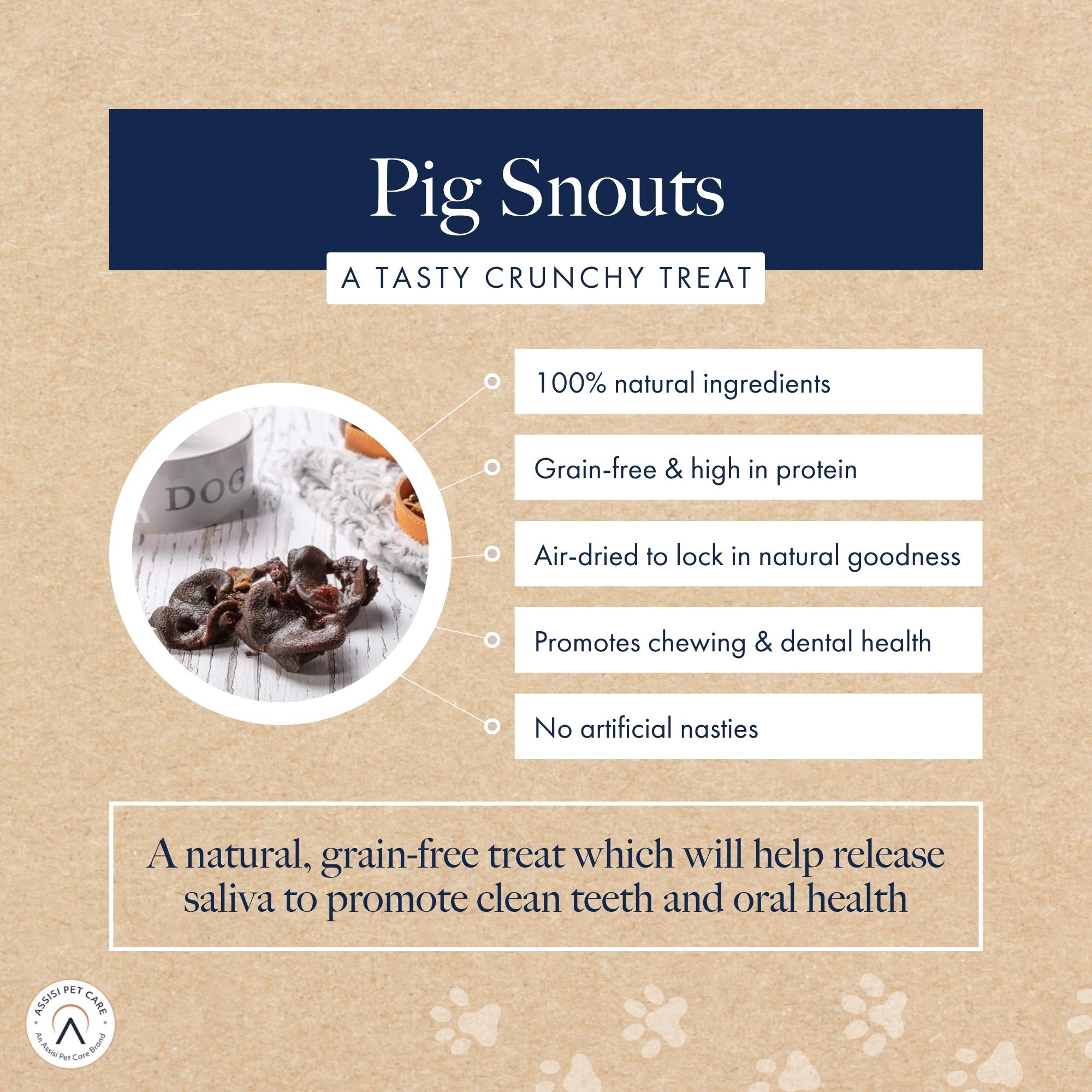 • TO MENTALLY STIMULATE & PROMOTE CLEAN TEETH - Our Pig Snouts are gently air dried to maintain their natural pink goodness. These longer lasting chews are great for encouraging chewing which not only mentally stimulates your dog helping to reduce boredom, but also releases saliva to promote clean teeth.