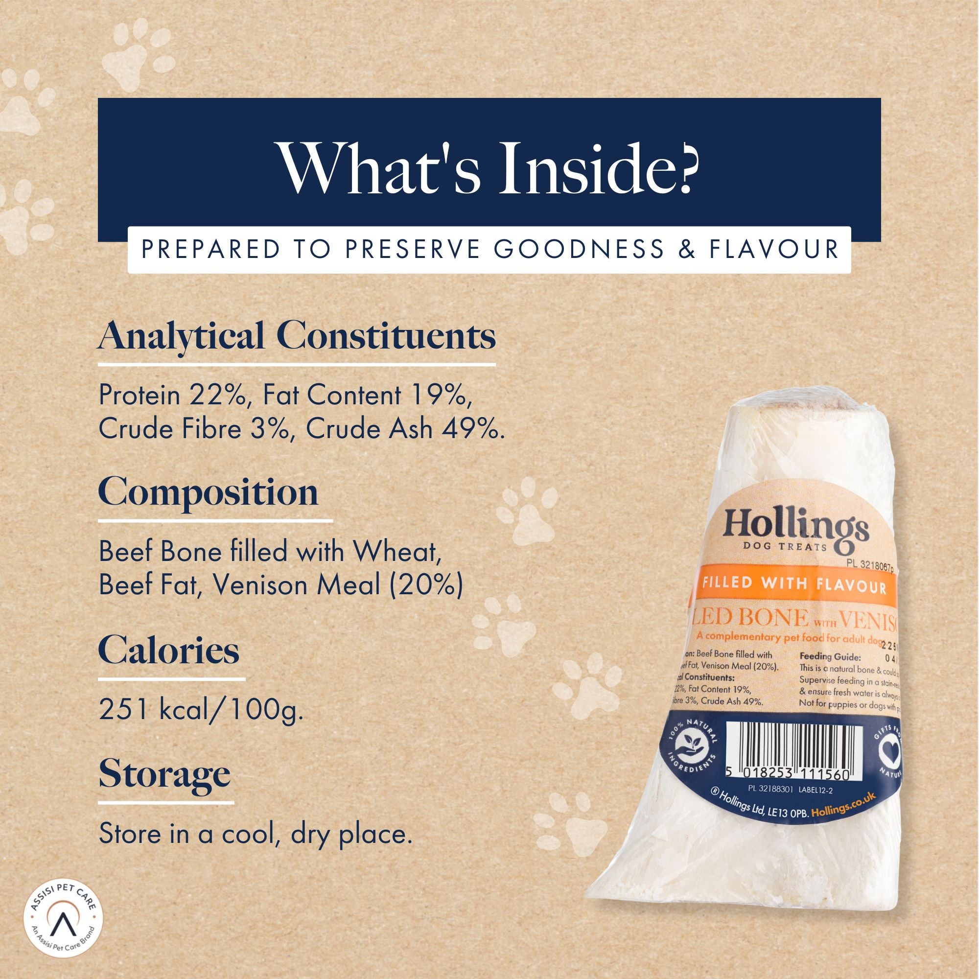 - MADE WITH HIGH QUALITY INGREDIENTS - A 100% natural bone, smoked & air dried to lock in the natural goodness, with a delicious venison filling that will satisfy even the fussiest of dogs. Our bones only contain the highest quality ingredients that your dog will love, with no artificial colours, flavours or preservatives.